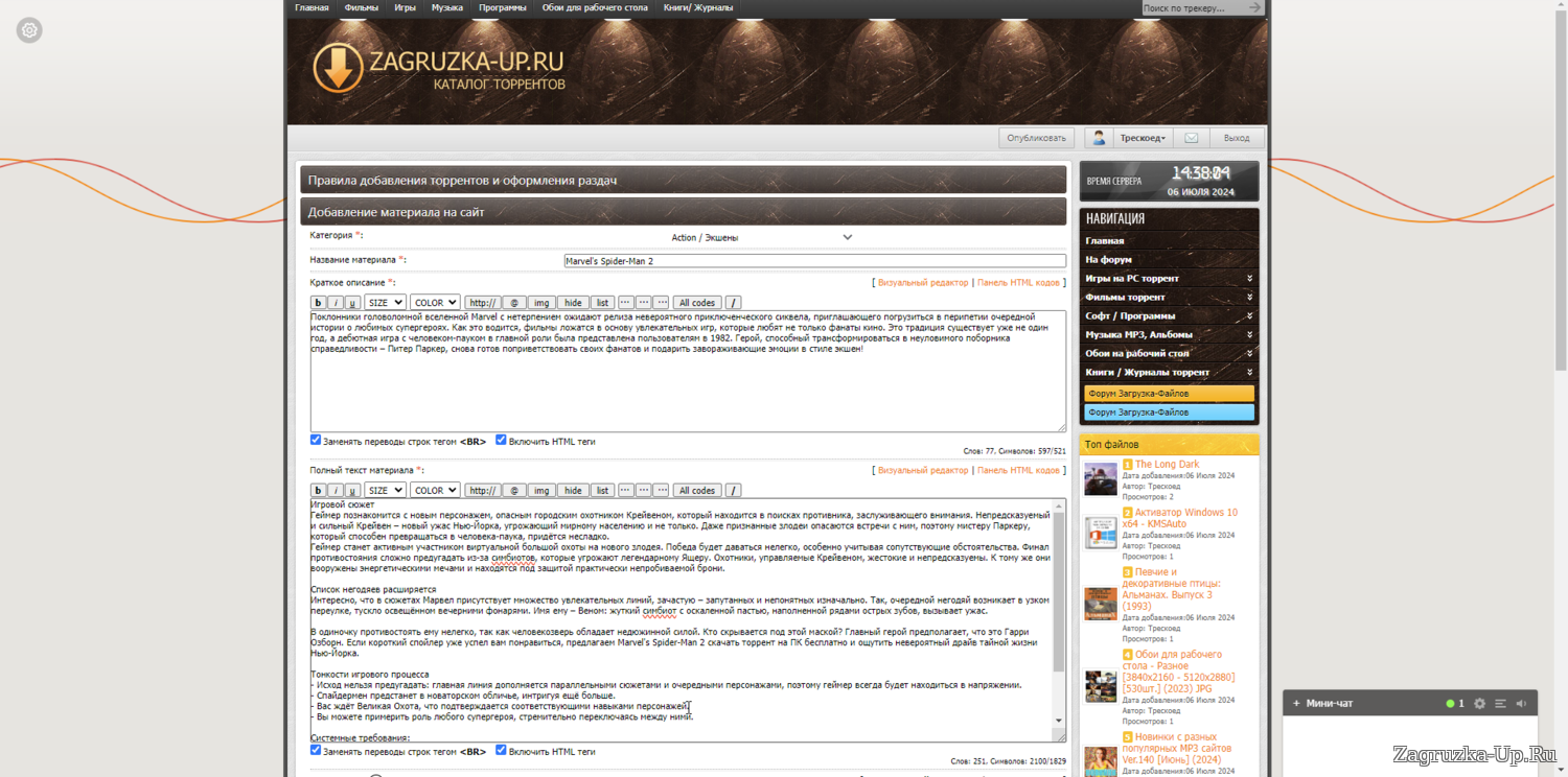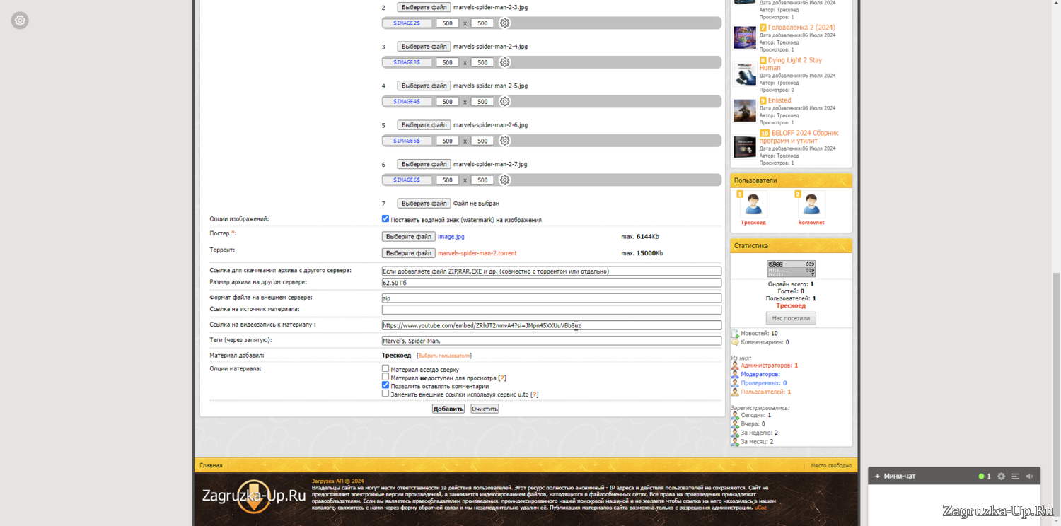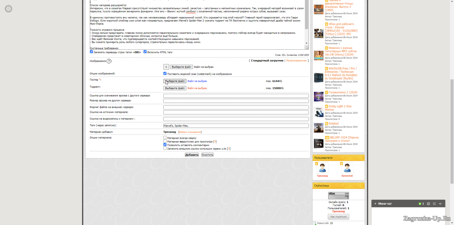 8. Если у вас есть материал не торрент а форматов rar, zip, exe, и др. то вы предварительно должны загрузить их на яндекс диск и от туда скопировать ссылку для скачивания и вставить её в соответствующее поле. (Желательно чтоб вы загрузили и торрент и добавили ссылку в формате файла) также не забудьте в поле прописать формат файла. (размер файла указывается независимо от того добавляете вы только торрент или оба файла).