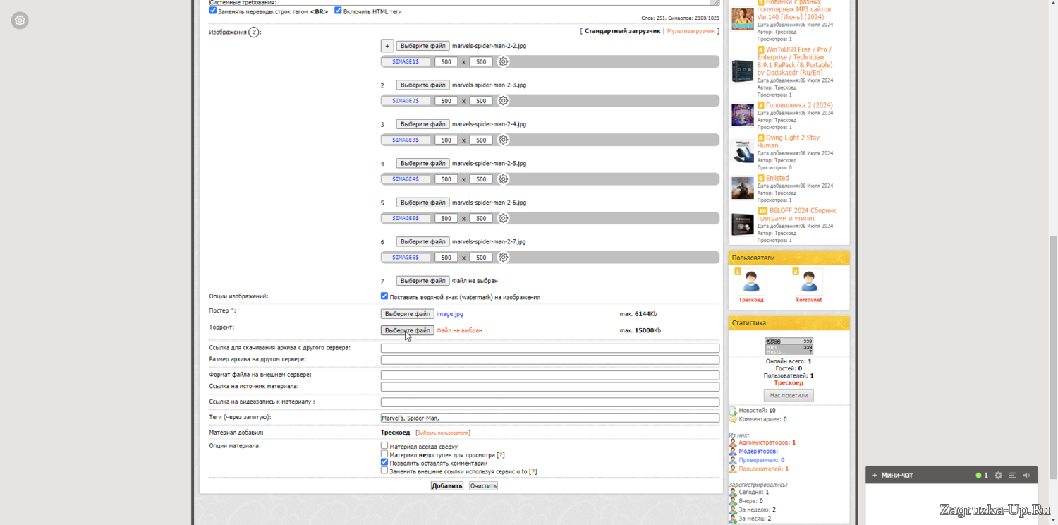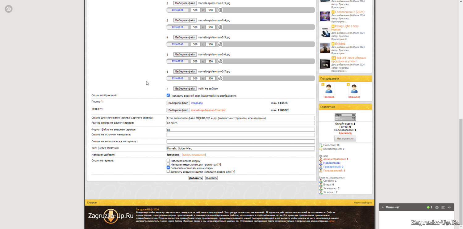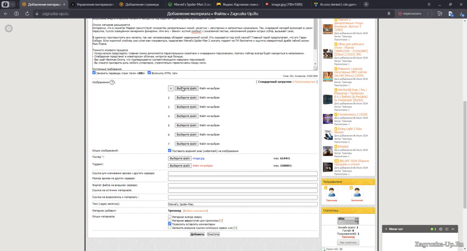 8. Если у вас есть материал не торрент а форматов rar, zip, exe, и др. то вы предварительно должны загрузить их на яндекс диск и от туда скопировать ссылку для скачивания и вставить её в соответствующее поле. (Желательно чтоб вы загрузили и торрент и добавили ссылку в формате файла) также не забудьте в поле прописать формат файла. (размер файла указывается независимо от того добавляете вы только торрент или оба файла).