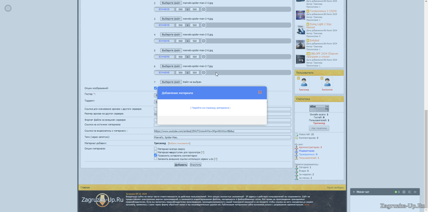 2. Выбираем пункт "Добавление материала на сайт".
