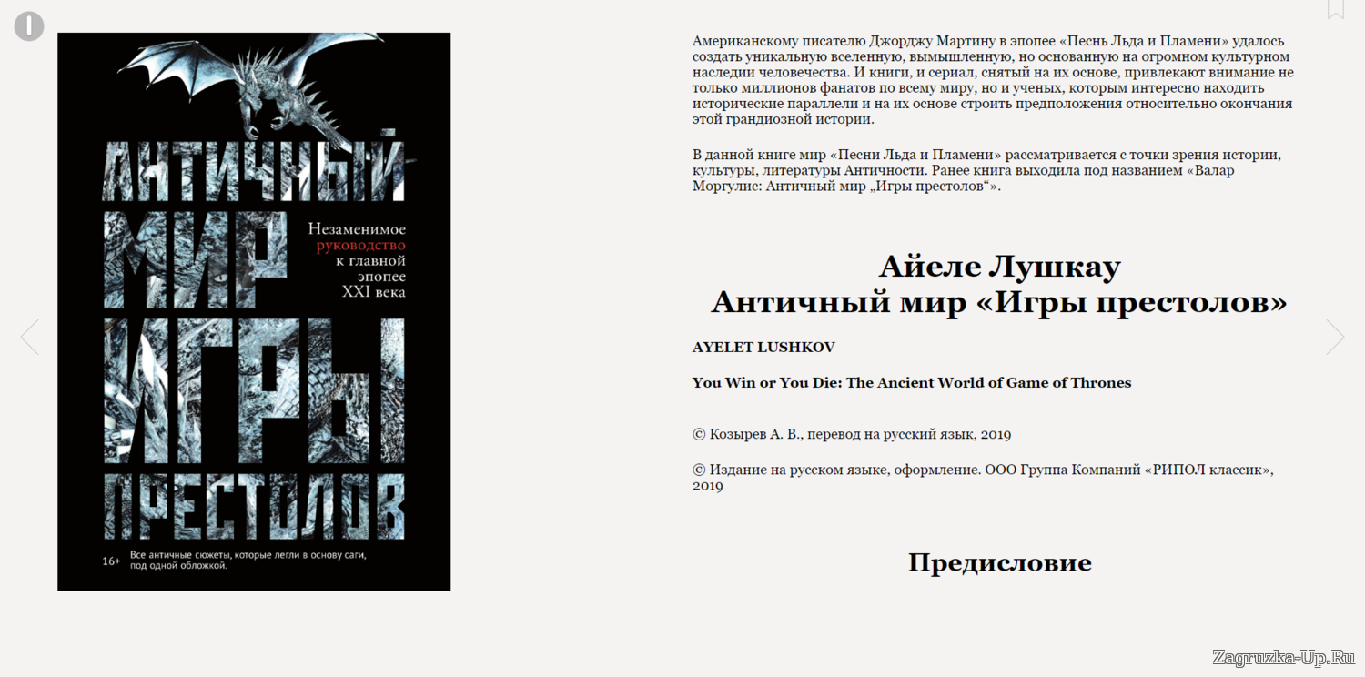 В данной книге мир «Песни Льда и Пламени» рассматривается с точки зрения истории, культуры, литературы Античности. Ранее книга выходила под названием «Валар Моргулис: Античный мир „Игры престолов“».