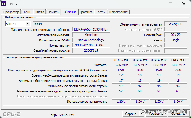 Тип памяти, размер, тайминги и характеристики модуля (SPD).